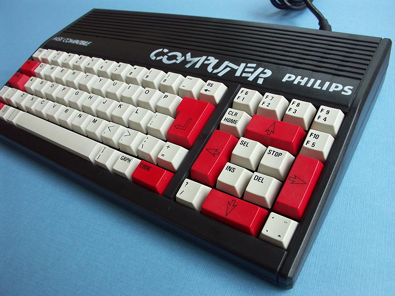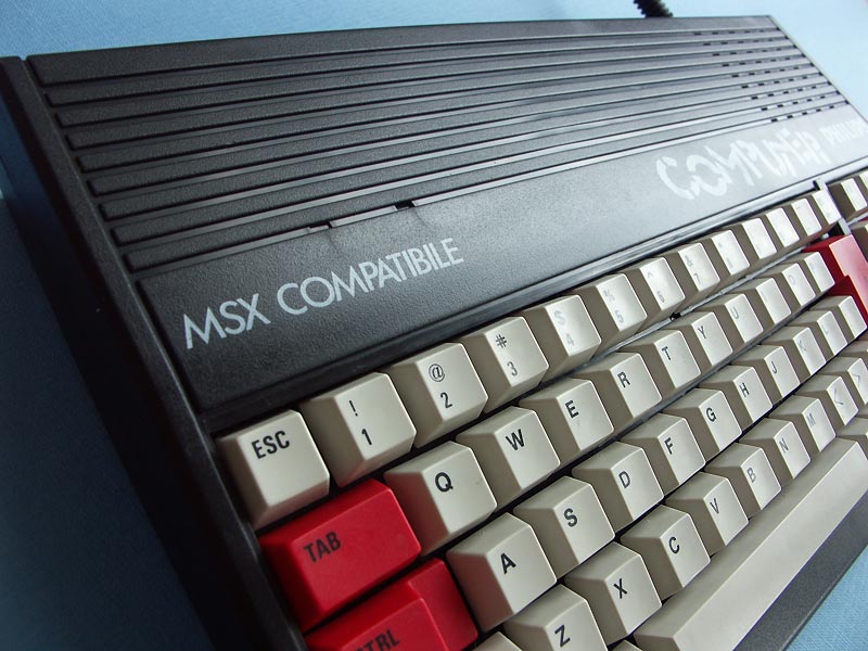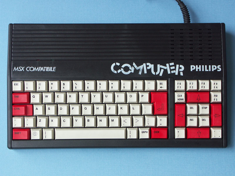 | Particularité : | C'est une machine vraiment bas de gamme que propose Philips aux consommateurs italiens en 1985. Ce que l'on remarque immédiatement c'est l'absence de port pour cartouches alors que c'est une caractéristique essentielle d'un ordinateur MSX, sans doute la raison pour laquelle sur celui-ci n'est indiqué que MSX compatible. Ensuite, et dès le premier contact, on est surpris par la mollesse du clavier qui s'explique par le fait qu'il n'y a aucun ressort de rappel sous les touches mais simplement une sorte de languette plastique qui par son élasticité doit les faire remonter. Enfin, d'autres petits détails confirment cette impression négative comme la légèreté de l'ordinateur, l'alimentation qui est externe, l'absence de bouton de mise en marche ou encore le câble péritel qui est fixe. Coté positif, je citerai la présence d'un bouton reset à l'arrière, un témoin lumineux de majuscules, un basic en version 3 et un look plutôt accrocheur.